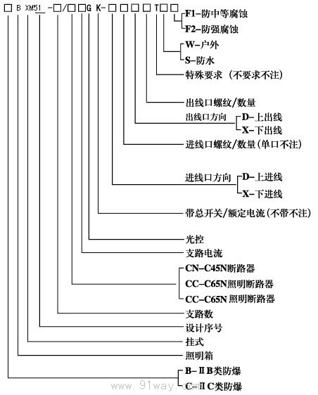 BXM51系列防爆(光控)照明配電箱(ⅡB、ⅡC)適用范圍: 1.1區、2區危險氣體場所; 2.ⅡA、ⅡB、ⅡC類T1~T6組爆炸性氣體或蒸氣環境; 3.戶內、戶外(IP54,IP65*) 產品特點: 1.鋁合金外殼壓鑄成型,表面噴塑,內裝高分斷小型斷路器和交流接觸器; 2.產品由隔爆主腔及增安型接線箱根據需要構成; 3.線路的接通與斷開可隨背景光線的強弱自動控制; 4.鋼管或電纜布線。 BXM51系列防爆(光控)照明配電箱(ⅡB、ⅡC)型號意義: