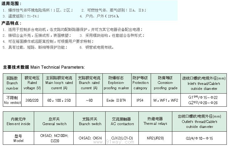 BXQ52系列防爆動力(電磁起動)配電箱(Ⅱ B)型號意義: 主要技術(shù)參數(shù): BXQ52系列防爆動力(電磁起動)配電箱(Ⅱ B)
