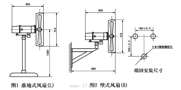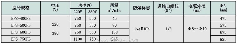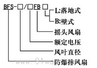 BFS-□FB系列防爆排風扇(搖頭)(ⅡB)適用范圍: 1.1區、2區危險氣體場所; 2.ⅡA、ⅡB類T1~T4組爆炸性氣體或蒸氣環境; 產品特點: 1.本產品由防爆電機、葉片、網罩(立柱、底坐、三角架)及搖頭機構等部分組成; 2.風葉由鑄鋁合金制成,避免磨擦時產生火花; 3.安裝方式為落地式及壁式; 4.電纜布線。 型號意義: BFS-□FB系列防爆排風扇(搖頭)(ⅡB)主要技術參數: