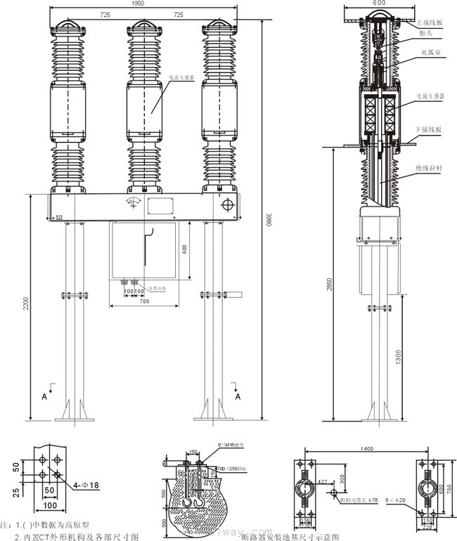 3.4 斷路器采用高架型瓷柱式結(jié)構(gòu),小巧美觀。絕緣件和密封面少,微水量和漏氣率極易得到控制。