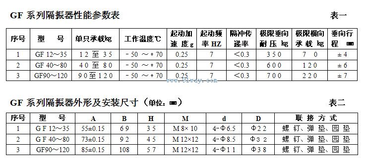 GF12~35;GF40~80;GF90~120單只承載范圍12㎏至120㎏的三種規(guī)格GF系列隔振器。