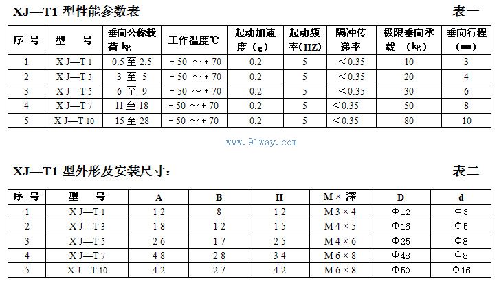 XJ-T型筒形橡膠型減震器XJ-T1--XJ-T15五種規(guī)格,單只承載0.5㎏至18㎏范圍 性能參數(shù):(見表一) 外形及安裝尺寸:(見表二.圖一)