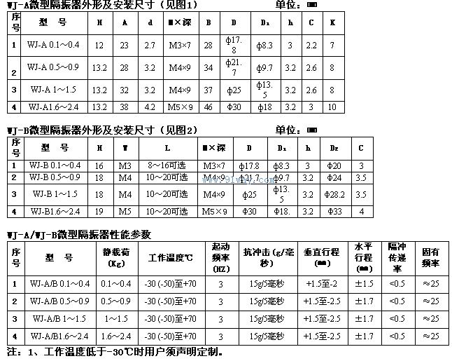 WJ-A/WJ-B微型減震器WJ-A/B0.1Kg~0.4Kg;WJ-A/B0.5Kg~0.9Kg;WJ-A/B1Kg~1.5Kg;WJ-A/B1.6~2.4Kg;四種制式兩種安裝形式