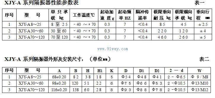 XJY-A8~25; XJY-A30~60; XJY-A70~120三種規格的該系列隔振器。