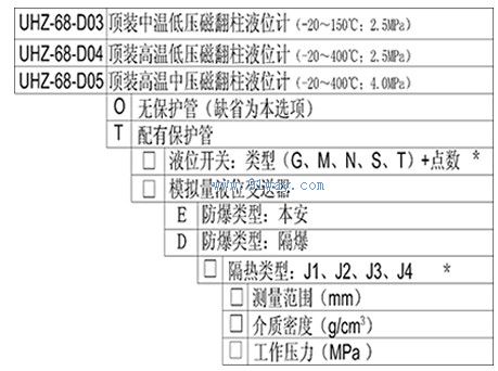 | 產品名稱: | UHZ68-D03/D05頂裝中高溫中低壓型磁翻板液位計 | |||||