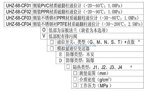 UHZ-68-CF01/CF02/CF03/CF04為四種側裝式防腐型磁翻柱液位計,CF01的材質為加強型PVC,主要特點是經濟實用,缺點是易老化,不易在露天環境下使用;CF02的材質為PPR,可以用于一般場合的防腐使用;CF03的材質為不銹鋼內襯PPR,強度和使用壽命較CF02型均有提高; CF04的材質為不銹鋼內襯PTFE, 主要特點是具有較高的耐腐蝕的性能和優秀的耐溫、承壓性能。