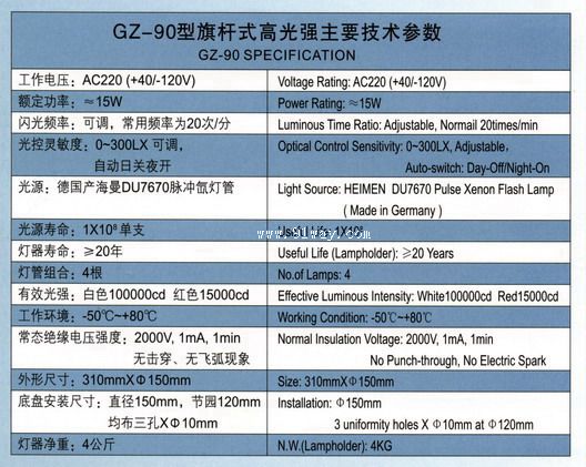 GZ-90型高光強航標燈(旗桿式)由電腦芯片控制脈沖氙燈。具有光度、四燈管二組 交替閃光,閃光強度恒定、復合透鏡聚光、無須控制箱 實現同步閃光,使用電源AC100V~260V寬電壓。燈管系德 國產品,燈殼采用鋁合金一體化設計。