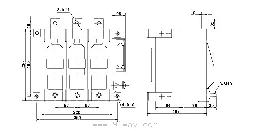ZN7-400型低壓真空斷路器外形尺寸及安裝尺寸: