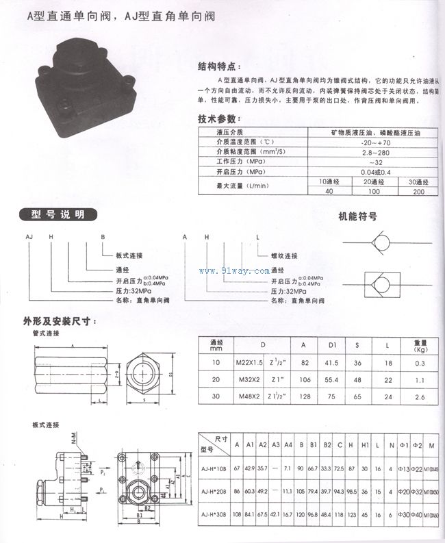 A型直通單向閥,AJ型直角單項閥均為錐閥式結構,它的功能只允許油液從一個方向自由流動,而不允許反向流動,內裝彈簧保持閥芯處于關閉狀態,結構簡單,性能可靠,壓力損失小,主要用于泵的出口處,作為背壓閥和單向閥用。