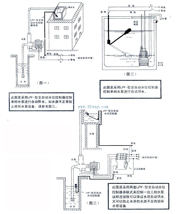 LPF型浮球控制器是一個能夠調(diào)節(jié)桶、槽或井中液位的開關(guān)。它可自動調(diào)節(jié)、易于操作、便于安裝、安全可靠、免予維修、無毒環(huán)保。它對污水有低抗作用。產(chǎn)品經(jīng)檢測中心檢驗合格,符合Q/QLP001-2002標(biāo)準(zhǔn)。廣泛應(yīng)用于家庭、廠礦等的水池、油、弱酸和弱堿的池、桶、槽、罐等的容器之中。如串聯(lián)兩個控制器,即一個放至水池,另一個放至水井來控制水泵,就能防止因水源不足開空泵而損壞水泵設(shè)備(見圖);也可以三個控制器串聯(lián),一個放至水塔,一個放至過濾池和一個放至河水(水井)能同時控制兩臺水泵設(shè)備。