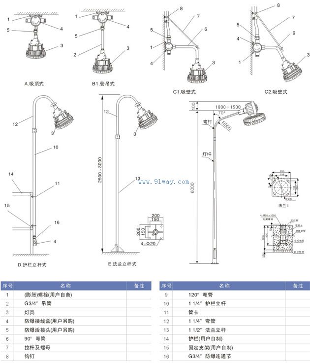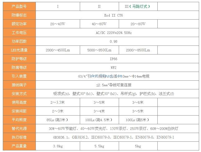 注:1、按照產(chǎn)品型號說明逐條選擇并注明防爆標(biāo)志;例如:需要40W、220V,吊桿式,配接線盒,氣體防爆,則產(chǎn)品選型為:GTBG310-40gH ExdIICT6 Gb;