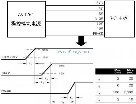 在PC主板的測試中,用多路ATX電源以正確的序列電壓給PC主板組件加電是非常重要的,不正確的序列不僅會導致組件不能啟動,還可能因誘發電流鎖存而損壞被測組件。因此,可用AV1761程控模塊電源建立一套7路的電源系統,通過編程改變其輸出順序和電壓,以驗證PC主板的性能。