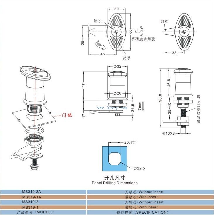 MS319把手電柜門鎖材質(zhì) 亞光鋅合金把手、基座,鍍鋅鋼轉(zhuǎn)軸、鋼栓 表面處理 鍍鋅
