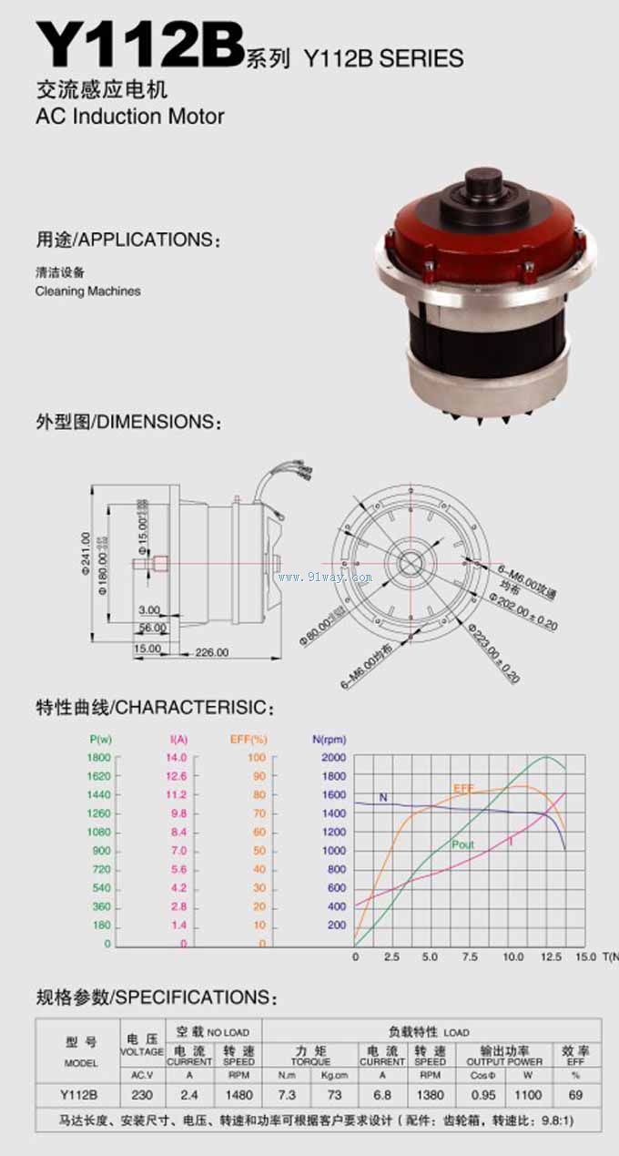 交流電機Y112B 產品用途:清洗設備 電壓:230V 負載電流:6.8A 輸出功率:1100W 負載轉速: 1380RPM 力矩:7.3N.m