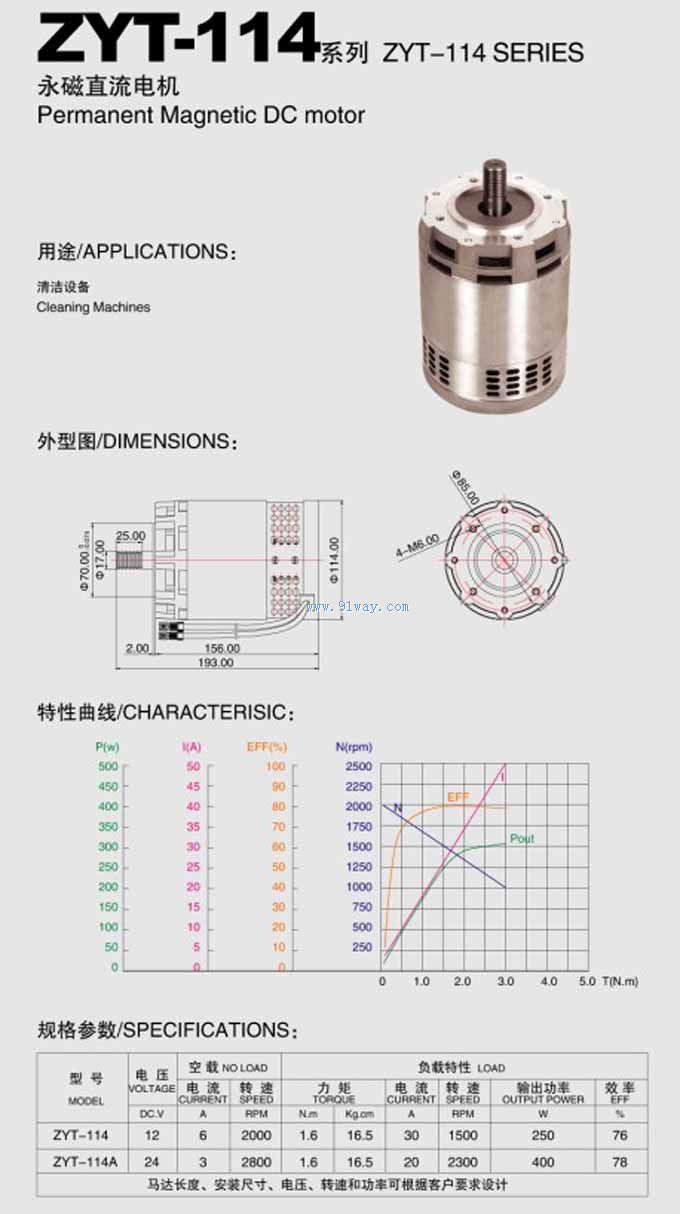 ZYT-114型永磁直流電機永磁直流電機ZYT-114 產品用途:清洗設備 電壓:12-24V 負載電流:20-30A 輸出功率:250-400W 輸出轉速:1500-2300RPM 力矩: 1.6N.m