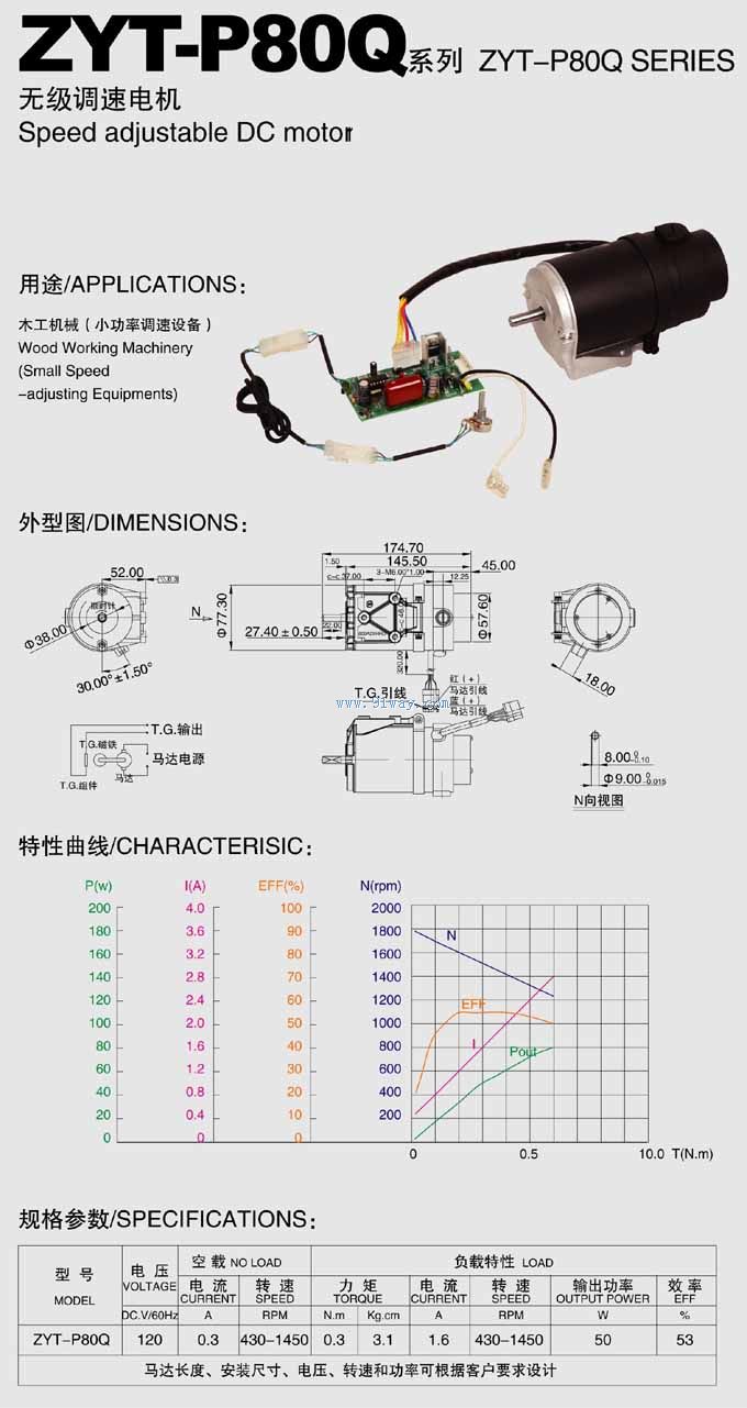 ZYT-P80Q無級調速電機無級調速電機ZYT-P80Q 產品用途:木工機械 電壓:DC 120V 60Hz 負載電流:1.6A 輸出功率:50W 負載轉速:430-1450RPM 力矩:0.3N.m