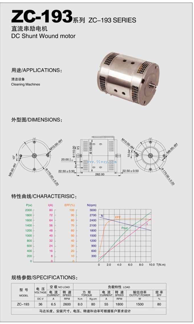 ZC-193型直流串勵電機串勵電機ZC-193 產品用途:清洗設備 電壓:DC 36V 負載電流:55A 輸出功率:1500W 負載轉速:1800RPM 力矩: 8.0N.m