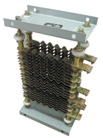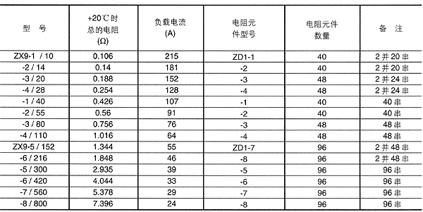 ZX9型電阻器系列按各種規格分別由40、48、96電阻元件裝配而成,電阻元件為鐵鉻鋁合金帶軋制成波浪形,結構按其寬度分為大、中、小三種,大片種中片端沖孔作為安裝之用,小片規格的兩端直接聯結,每一電阻元件的聯結均憑緊固螺母壓緊,以保證良好的接觸電阻。電阻器安裝時必須使電阻元件垂直位置放置。
