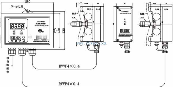 QCX-ME型用于雙梁起重機20t+20t,倍率是4,采用2只旁壓式傳感器,其型號標注為:QCX-ME-4-20t+20t/BCQ-2.5t(2)。總體連接示意圖如下: