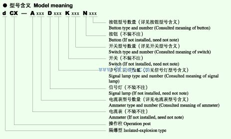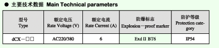 dCX系列防爆操作箱適用范圍 爆炸性氣體環境:1區、2區; 爆炸性氣混合物級別:ⅡA、ⅡB; 爆炸性氣混合物溫度組別:T1-T6; 戶內、戶外(IP54)。 產品特點 鑄鋁合金外殼,表面噴烤金屬漆; 內可裝轉換開關、按鈕、信號燈、電流表等,具體型式可要據用戶要求確定; 轉換開關有20多種功能可由用戶自由選擇; 進線口大小及數量按用戶要求的示意圖定制; 所有緊固件均采用不銹鋼材質; 產品出廠銘牌上只體現各元器件的代號及其總數量。 dCX系列防爆操作箱型號含義 技術參數