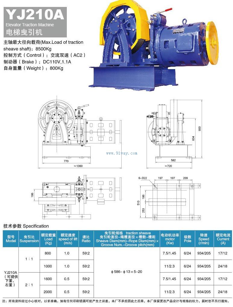 YJ210A(800-2000Kg,0.5-1.0m/s)交流雙速曳引機