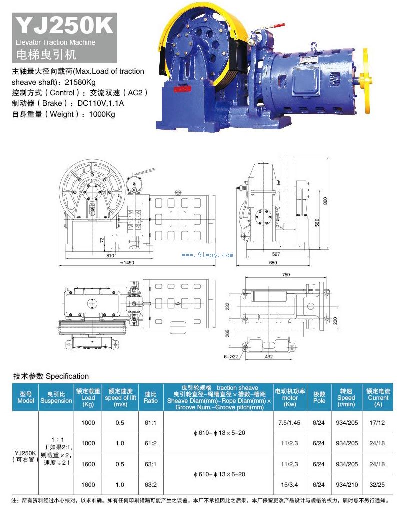 YJ250K(1000-3200Kg,0.5-1.0m/s)交流雙速曳引機