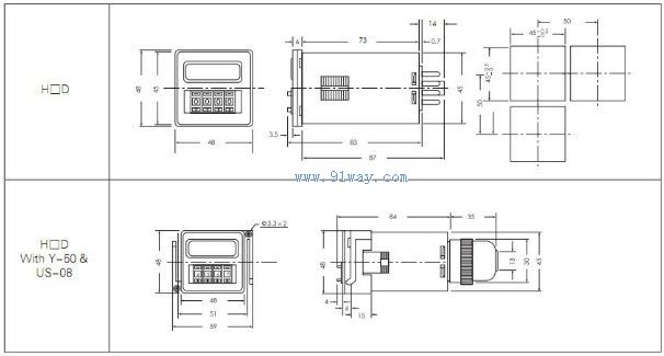 H2D,H3D,H4D數位式限時繼電器外觀尺寸圖