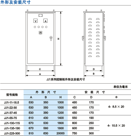 JJ1系列自耦減壓起動控制柜適用于交流50HZ(或60HZ),額定工作電壓為380V或660V、功率為11KW~300KW的三相鼠籠型感應(yīng)電動機(jī)作降壓起動,并可加速電動機(jī)至額定轉(zhuǎn)速和人為停止電動機(jī)。對電動機(jī)具有過載、短路等保護(hù),對自耦變壓器裝有起動時間的過載保護(hù)