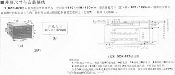 1 GZK-870的安裝為嵌裝式外殼結構,外形尺寸170×110×150mm,結構安裝開孔尺寸(寬×高)162×102mm.側面設安裝孔,緊固附件的掛鉤插入孔內,旋附件上螺絲既把控制器固定在屏上 (見圖2)、接線(圖3).