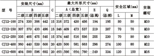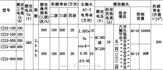 CJ12系列交流接觸器 用途 CJ12系列及派生的CJ12B、CJ12S、CJ12Z系列交流接觸器適用交流50Hz,額定電壓至380V,額定電源至600A的電力線路中。主要供治金、軋鋼企業重機等的電器設備中作遠距離接通和公斷電路、并作為交流電動機頻繁地起動,停止和反接之用。 型號及其含義 特性 1、接觸器的基本參數 2、接觸器的基本觸頭接通與分斷能力