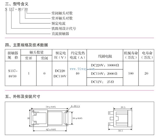 S137直流接觸器主要用于直流工作電壓至220V的電路中,遠距離接通和分斷直流電路,特別適合于鐵路機車暖風、熱水器、照明等的控制。不適合于控制直流電機的頻繁起動及電感性線圈。