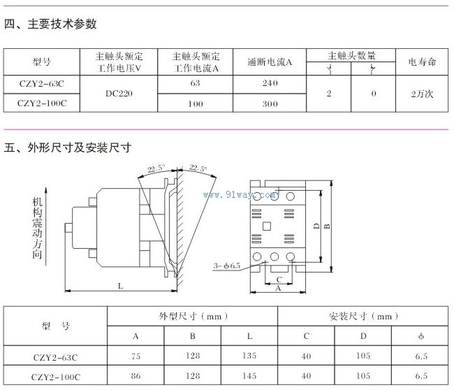 一、用途 CZY2-63C、-100C系列直流接觸器適用于額定電壓至直流220V,供遠距離瞬時接通和分斷高壓斷路器的電磁操作機構使用。 與CZY1比較具有良好的防震動性能,外型美觀。 三、安裝及使用條件 1、海拔不超過2000m(高海拔地區訂貨時要特殊說明); 2、周圍空氣溫度-25℃~+40℃; 3、安裝面與垂直面的傾斜角度<+22.5°(見圖),當現場震動較大時,建議垂直震動方向安裝,防止震動誤吸合; 4、安裝在能防雨、雪、風、沙的環境中; 5、采用螺釘安裝或75mmU型導軌安裝。