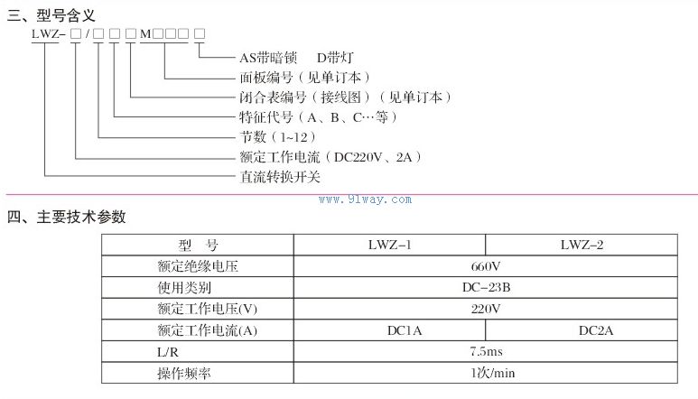 LWZ- 系列轉(zhuǎn)換開關(guān)主要用于額定電壓至直流220V及以下的電路中做接通分?jǐn)嗪娃D(zhuǎn)換電路之用,也可直接控制小容量電動(dòng)機(jī)和做主令控制之用。