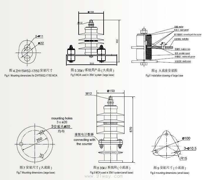 HY5W系列復合絕緣氧化鋅避雷器外形和安裝尺寸見圖1~9