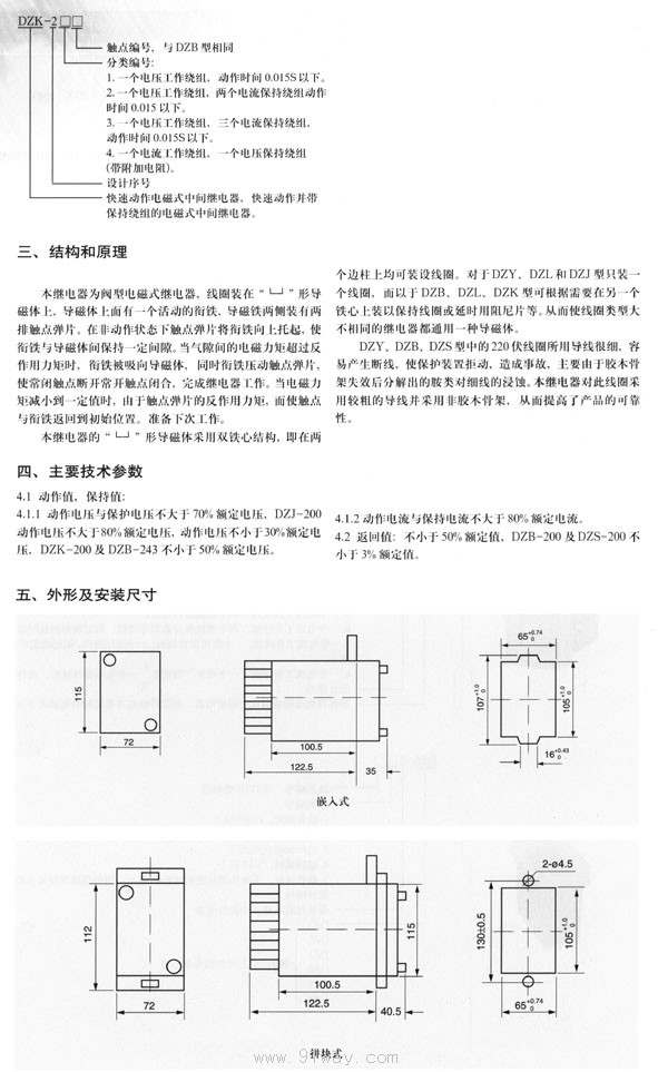 DZ-200系列中間繼電器用于各種保護和自動控制裝置中,以增加保護和控制回路的觸點數量和觸點容量。    DZY-200、DZL-200、DZJ-200、DZS-200、DZB-200、DZK-200、DZY-200X、DZB-200X、DZJ-200X、DZL-200X、DZS-200X、DZK-200X