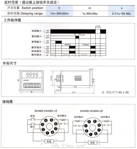 SH48S(DH48S)是引進國外進技術,采用先進大規模專用集成和LED數碼管顯示,參照國外工藝標準,可代替OMRON公司H5CN及同類產品,外形美觀,延時范圍寬、精度高、功耗低壽命長,觸頭容量大等優點,使用于自動化控制系統控制元件之用。