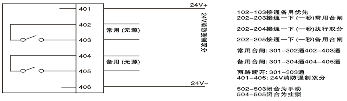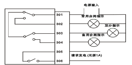 注:HL1、HL2分別為常用電源、備用電源來電指示;HD1、HD2分別為常用電源、備用電源投入指示;FU1、FU2為2A保險絲;302~305為開關端子。