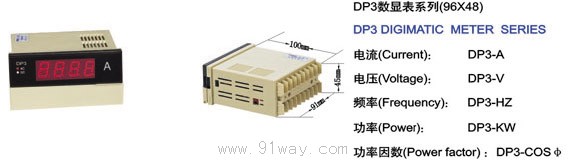 二、DP3系列數顯表技術指標:最大顯示:±1999 ;輸入方式:單端輸入;儲存環境溫度:0~40℃;精度:±0.5%滿量程±1個字;測量速率:約2.5次/秒;電源:AC 100V 220V……  DC 5V 12V24V……