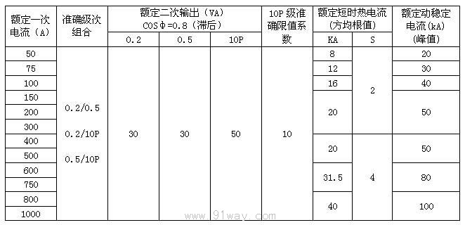 3、額定一次電流、準確級次組合、額定二次輸出及動、熱穩定電流電流見下表。
