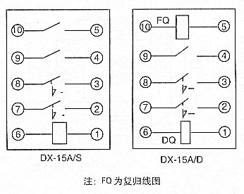 | DX-15A/S | 兩副斷電保持動合觸點兩副斷電復歸動合觸點 | |||