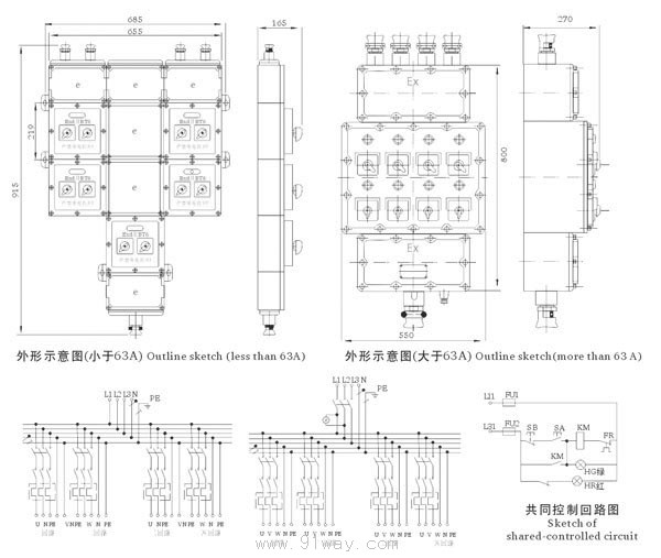 | 支路電流大于 Branch current more than 63A | 塑殼斷路器,交流接觸器萬能轉換開關,熱繼電器 MCCB,AC Contactor selector threamal relay | 采用大殼體組合 Big enclosure combined |