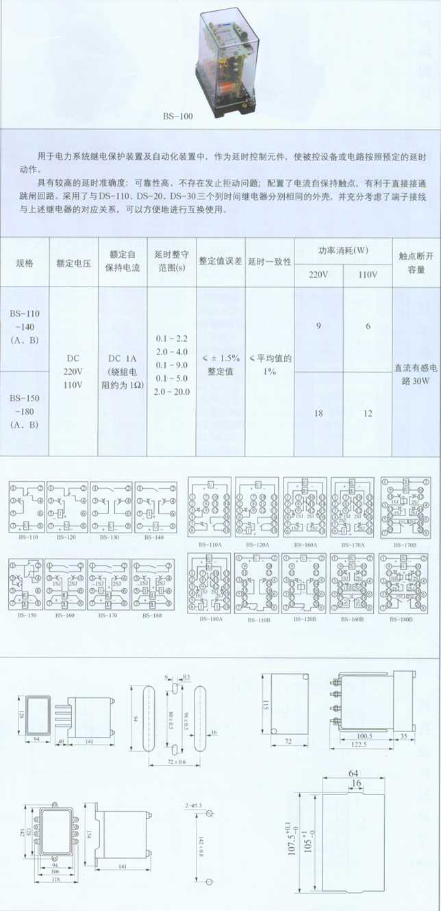 BS-110A,120A,160A,170A,180A時(shí)間繼電器用于電力系統(tǒng)繼電保護(hù)裝置及自動(dòng)化裝置中,作為延時(shí)控制元件,使被控制設(shè)備或電路按照預(yù)定的延時(shí)動(dòng)作。