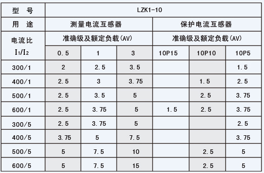 依據電流變比、準確級和額定負載的不同,該系列電流互感器分以下幾種類型,