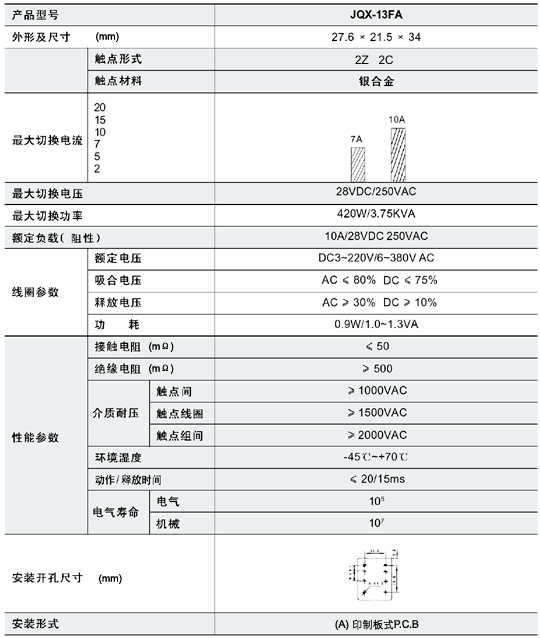 JQX-13FA印刷線路板式繼電器技術參數