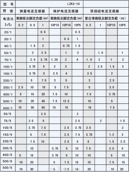 依據(jù)電流變比、準(zhǔn)確級和額定負(fù)載的不同,該系列電流互感器分為以下幾種類型,具體參數(shù)詳見各型號對應(yīng)的參數(shù)表。可按用戶的要求定制不同規(guī)格和參數(shù)的電流互感器。