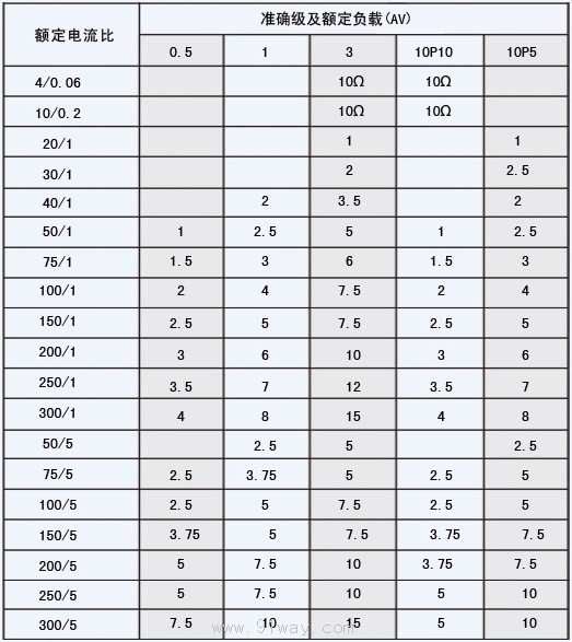 額定電流、準確級及其額定負載如下表所示: