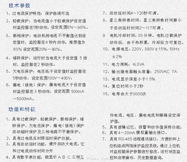 熱過載保護、防爆電機 Eexe的熱過載保護、斷相保護、三相不平衡保護、堵轉(zhuǎn)保護、欠電壓保護、接地故障保護、輕載保護、空載保護。