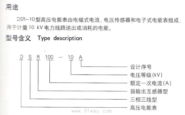 DSR-10型高壓電能表由環氧樹脂全澆注弱輸出組合型互感器以及一臺電子式電能表組成,可用于戶外或戶內。互感器安裝在計量點的高壓線路上,電能表安裝在安全和適于觀察的地方。