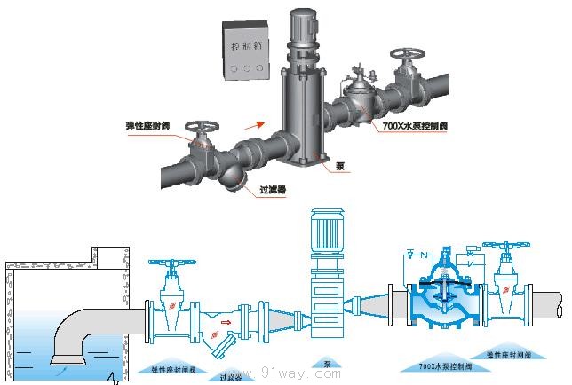700X水泵控制閥是一種安裝在高層建筑以及其他給水系統的水泵出口處,防止介質倒流的逆止類閥門。當水泵即將停止供水前。閥門先行緩慢關閉90%左右,防止突然停泵而產生的水錘或水擊聲;當水泵完全停止后,閥門再完全關閉,防止泵出的水回流,有效地保護水泵,免受回流的沖擊而產生反轉。700X水泵控制閥是水泵出口必不可少的保護裝置。閥門呈流線型設計。通過電磁閥的導控實現準確的啟閉。使用安全可靠,有效地防止水錘和水擊聲,使用壽命長,安裝、維修方便。