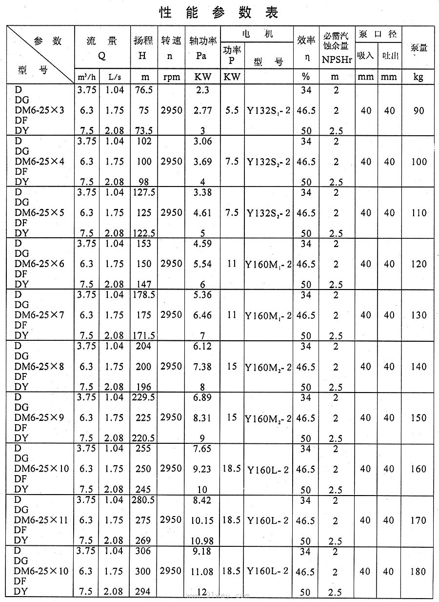 D、DG、DM、DF、DY型多級離心泵技術參數6